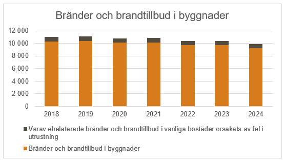 Räddningstjänsten har under åren 2018–2024 genomfört närmare 75 000 utryckningar till följd av brand eller brandtillbud i byggnader. Under 2024 fortsatte den övergripande trenden med en svag minskning av det totala antalet bränder och brandtillbud i byggnader.