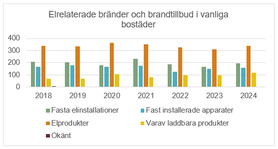 Drygt hälften av alla bränder och brandtillbud inträffade i vanliga bostäder och nästan 4 900 av händelserna orsakades av fel i elrelaterad utrustning. Detta resulterade i genomsnitt nära 700 händelser per år. Av dessa stod elprodukter för nästan hälften.