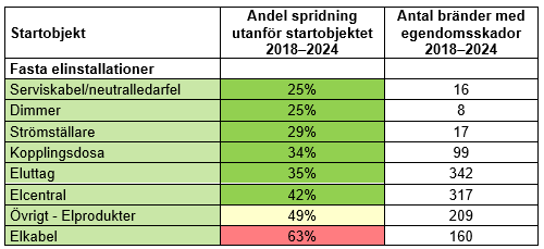 Tabellen nedan visar i hur stor andel av bränderna som branden spridit sig utanför startobjektet. Rödmarkerade startobjekt har störst tendens att sprida sig vidare, följt av gulmarkerade och sedan grönmarkerade. Tabellen är uppdelad på: