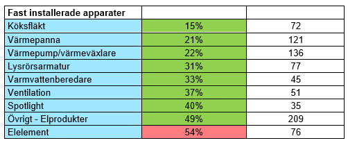Fast installerade apparater har över tiden minskat som startobjekt, men ökade något under 2024. Lysrörsarmaturer minskar igen efter en tillfällig uppgång under 2023. I kategorin ingår även solcellsanläggningar, som både 2023 och 2024 haft en tydlig ökning och bidrar till uppgången.
