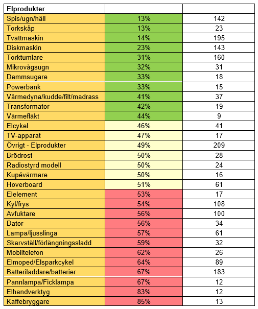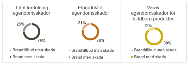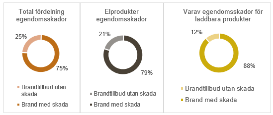 Under 2023 stod laddbara produkter för 1,5 procent av de elrelaterade försäkringsärendena. Denna andel ökade under 2024 till 2,9 procent enligt Svensk försäkring. Samtidiga motsvarade laddbara produkter 15 procent av de elrelaterade händelserna 2023 och 17 procent 2024.